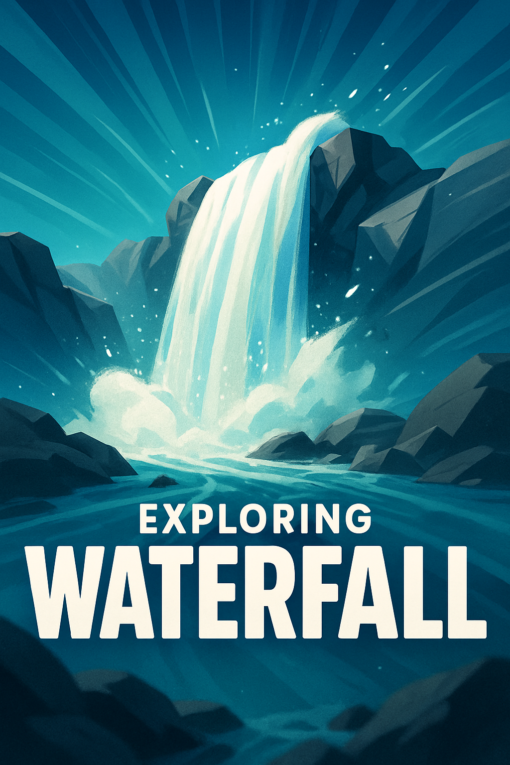/Collection: /by davooda/Type: PNG/A vibrant illustration of a waterfall cascading down rocky cliffs, surrounded by dynamic lines radiating outward. The foreground features blurred elements to add depth, enhancing the overall composition.