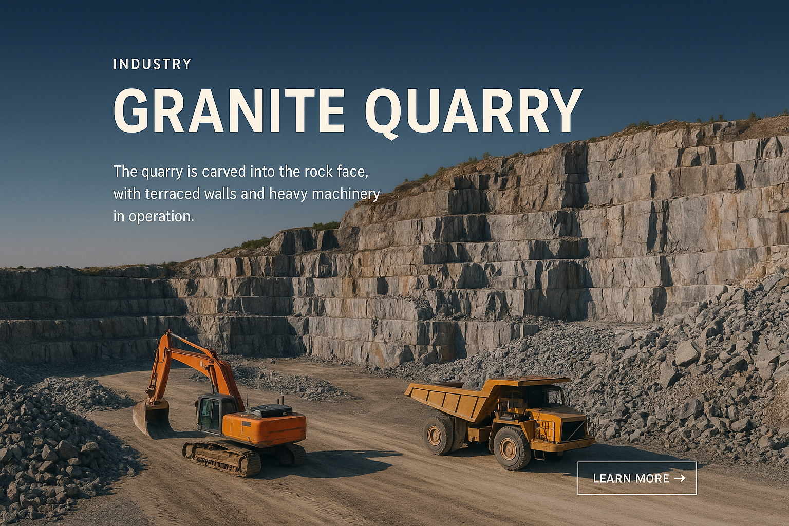 A striking image of a granite quarry featuring heavy machinery, terraced rock walls, and a clear blue sky. The scene captures the industrial essence of granite extraction.