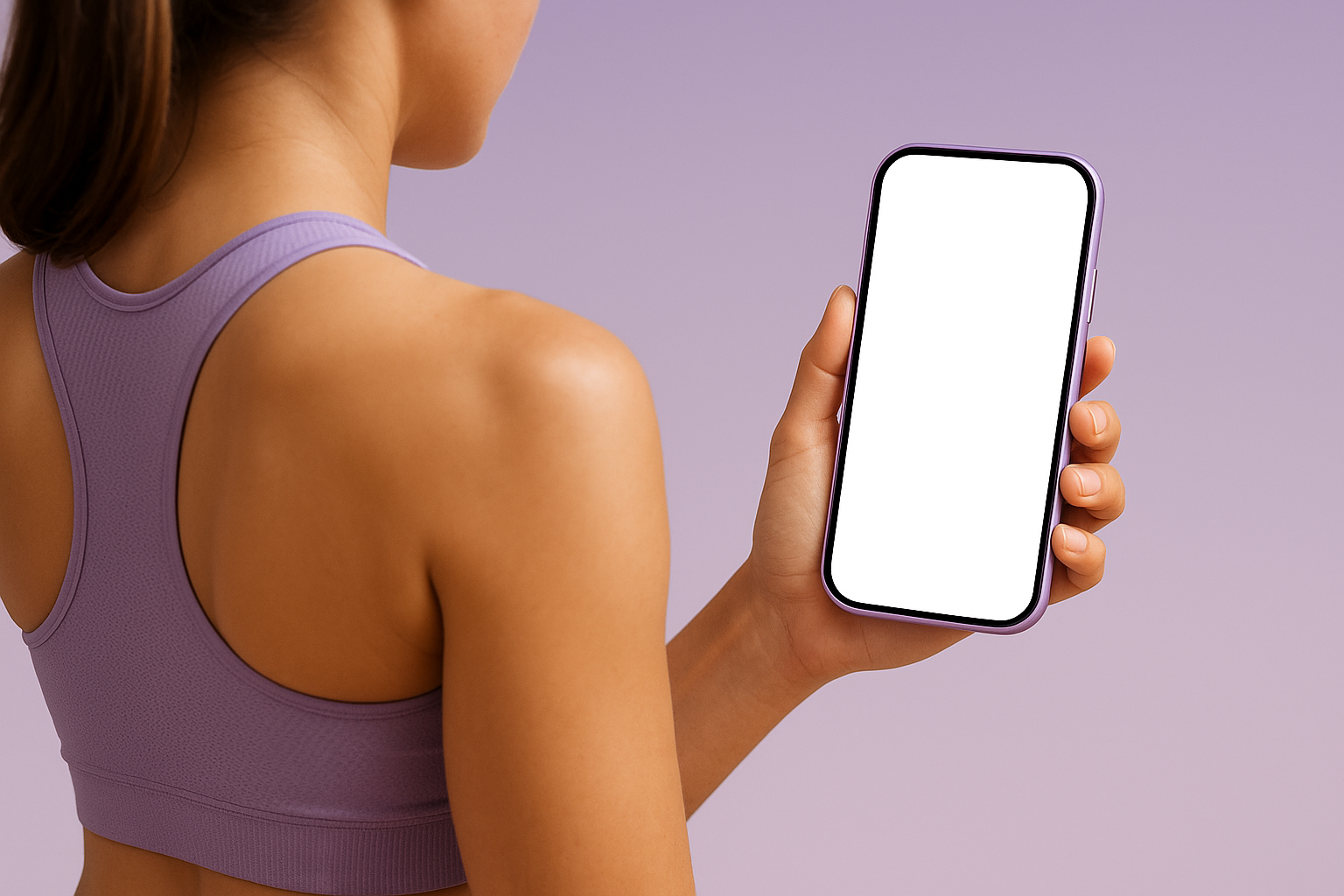A close-up image of a woman in athletic wear holding a purple smartphone with a blank screen. The image captures the phone from a side angle, emphasizing its design against a soft purple background.