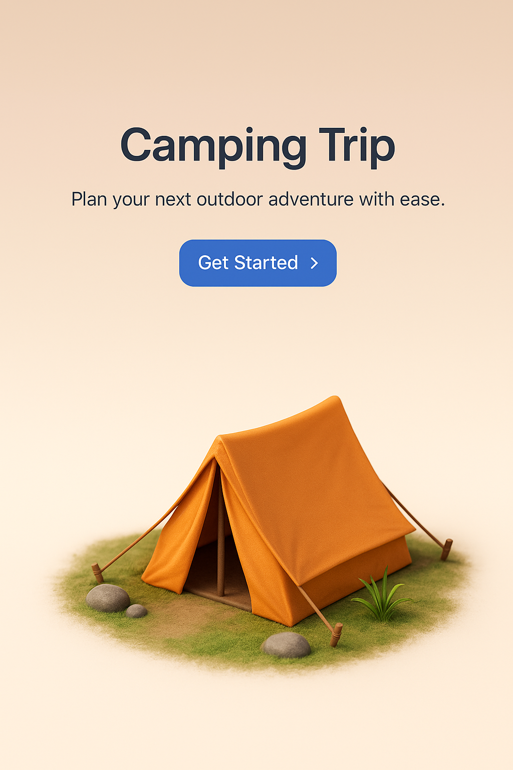 A detailed 3D visualization of a camping scene featuring an orange tent, surrounded by rocks and grass. The background has a smooth gradient, enhancing the outdoor adventure theme.