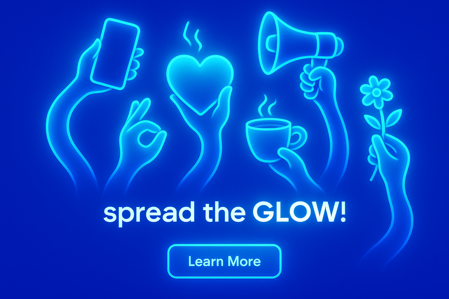 A vibrant collage featuring multicolored arms holding various objects like a smartphone, heart, and megaphone. The glowing elements create a lively atmosphere against a solid blue background.