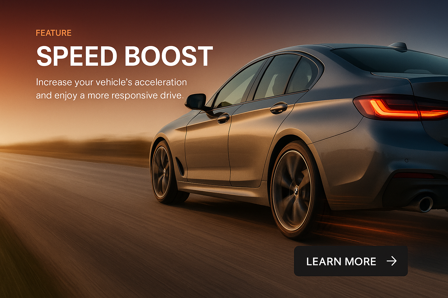 A sleek web interface showcasing a car in motion, emphasizing speed boost features. Includes a gradient background and clear call-to-action button.