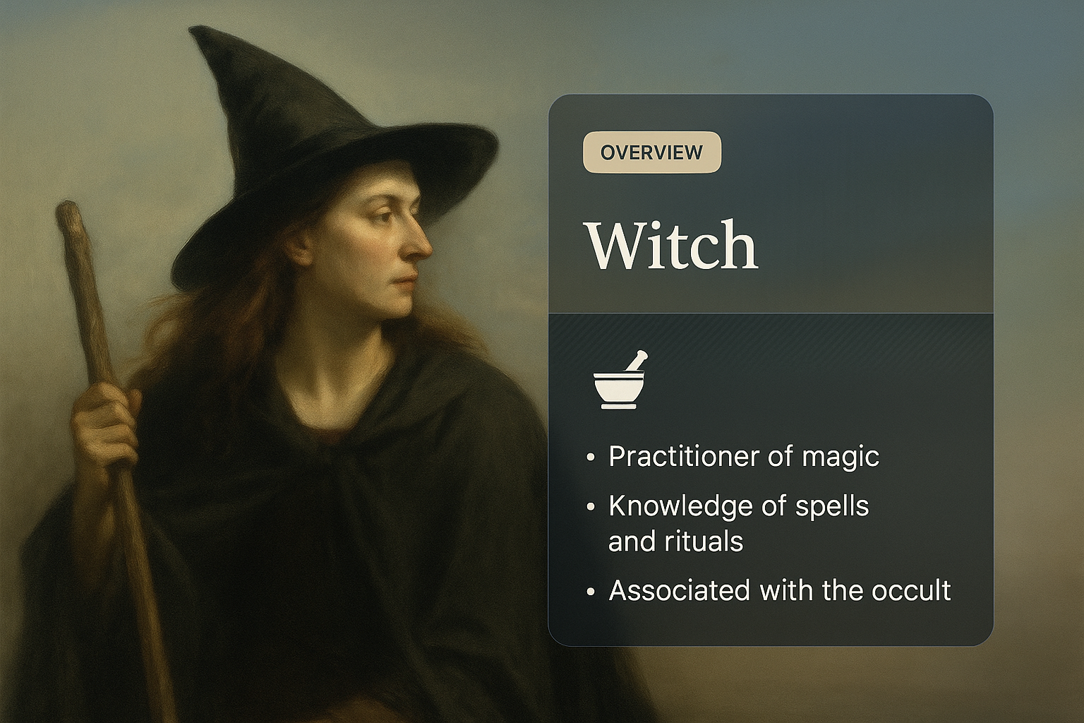/Collection: /by davooda/Type: PNG/A striking illustration of a witch, featuring a dark, gradient background and an informative overlay. The overlay includes a title, icon, and descriptive text about witchcraft.