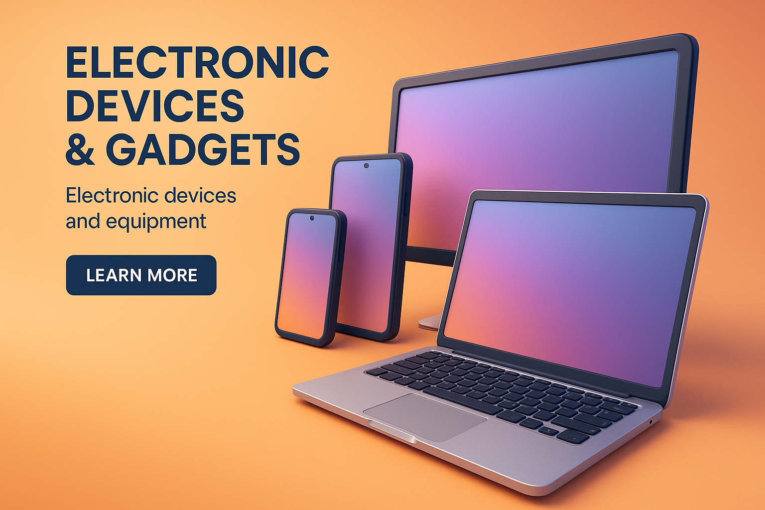 A vibrant promotional graphic featuring various electronic devices including laptops, tablets, and smartphones, designed for tech marketing purposes.