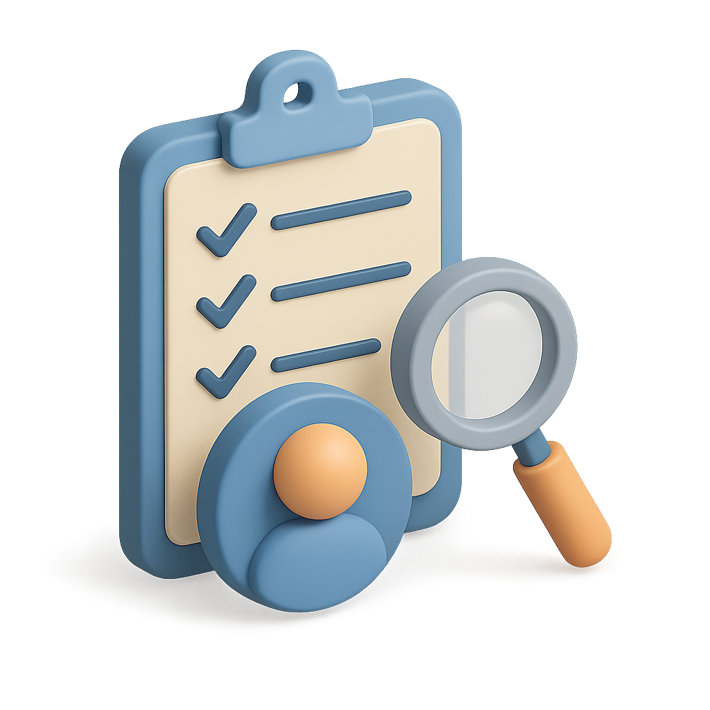 A visually appealing 3D icon depicting user research. It features a clipboard with checklists and a magnifying glass, all rendered with a soft, isometric design.