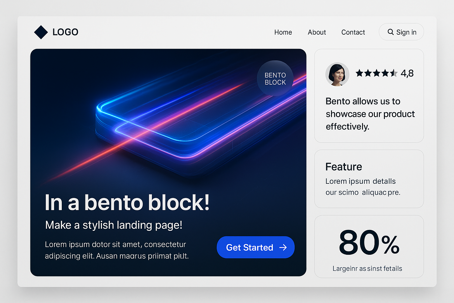 /Collection: /by davooda/Type: PNG/A visually striking 3D illustration of a bento-style landing page featuring neon light lines, action buttons, and a sleek layout. The design emphasizes modern aesthetics and functionality.