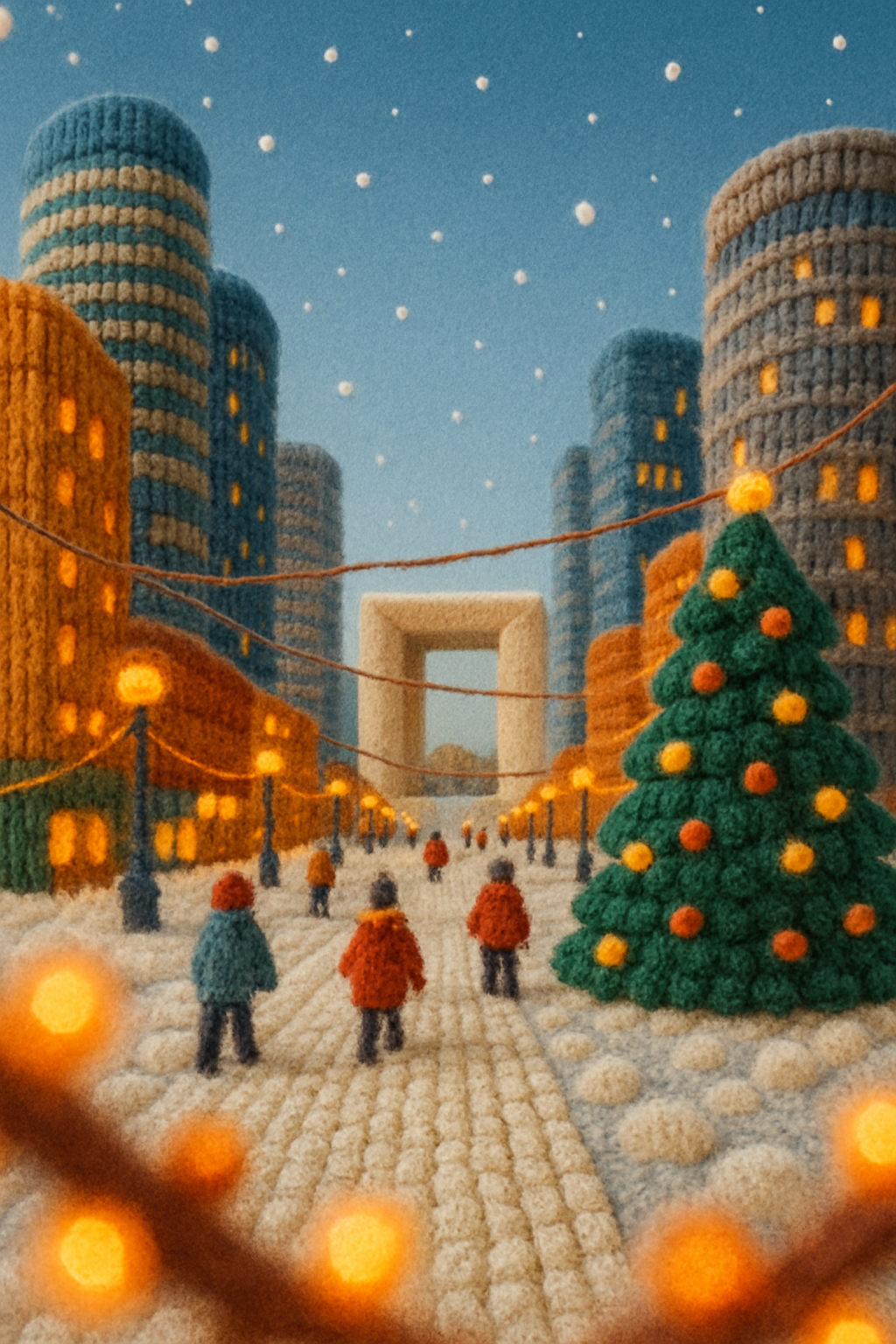 /Collection: /by davooda/Type: PNG/A whimsical winter scene of La Défense in Paris, featuring knitted buildings and a snow-covered esplanade. Small figures stroll among festive lights and a decorated tree, creating a warm holiday vibe.