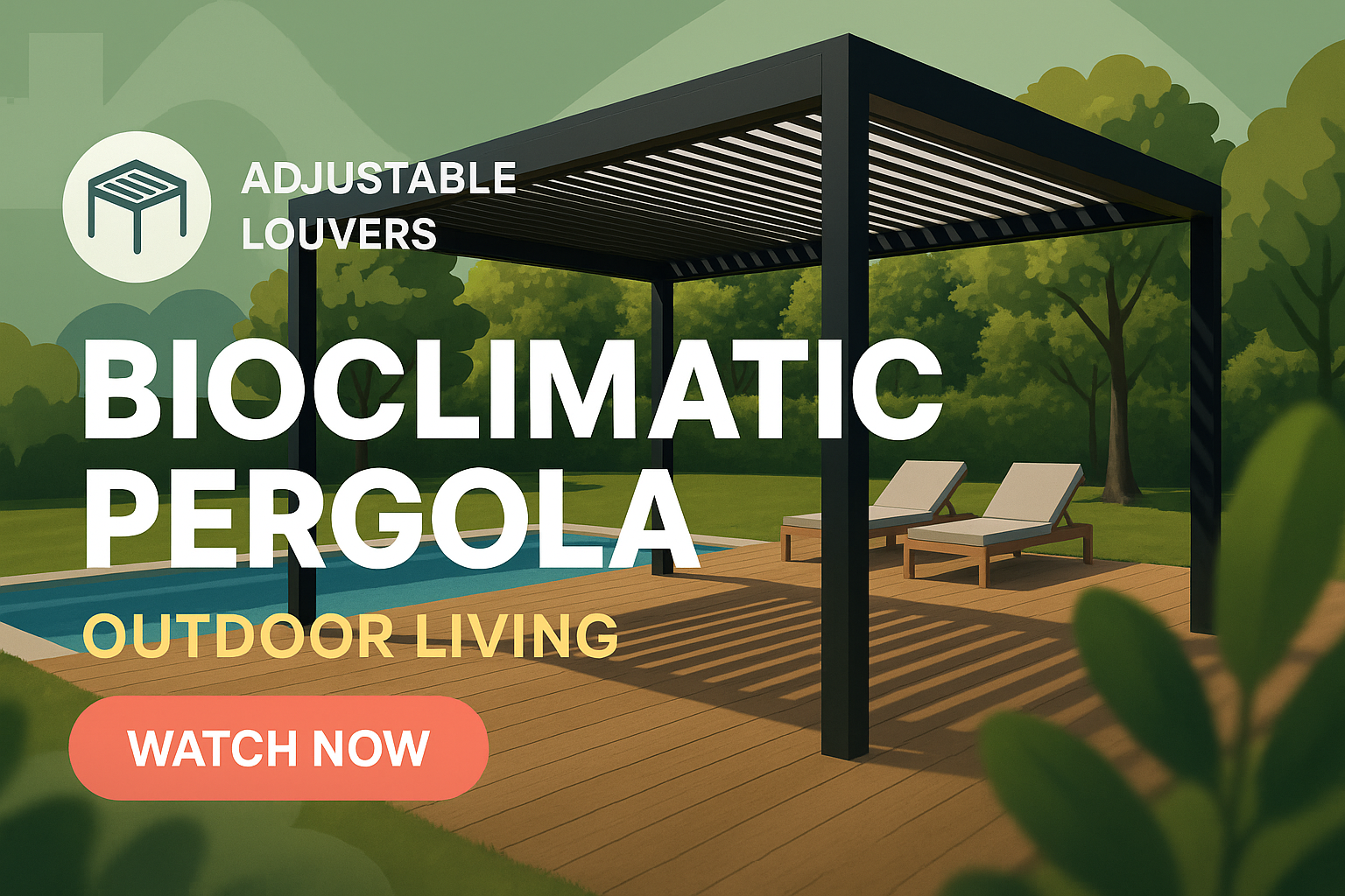 Promotional Graphic for Bioclimatic Pergola with Outdoor Living Theme
