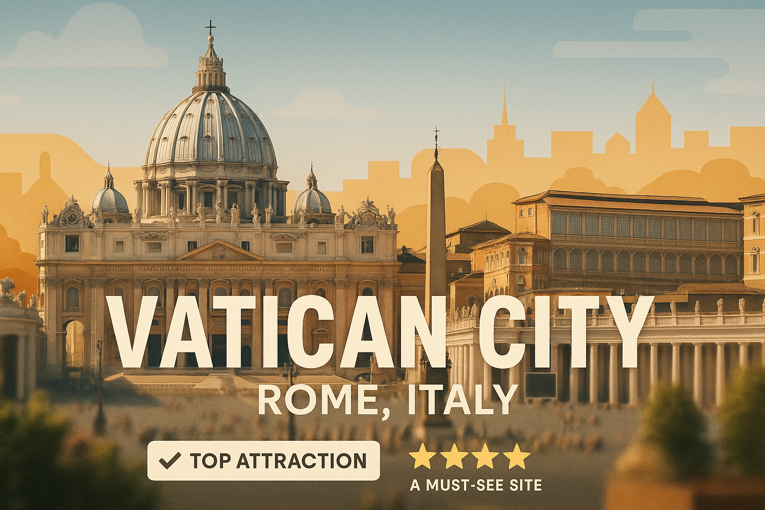 Travel-themed graphic showcasing Vatican City, featuring iconic architecture and a warm color palette, ideal for tourism promotions and travel blogs.