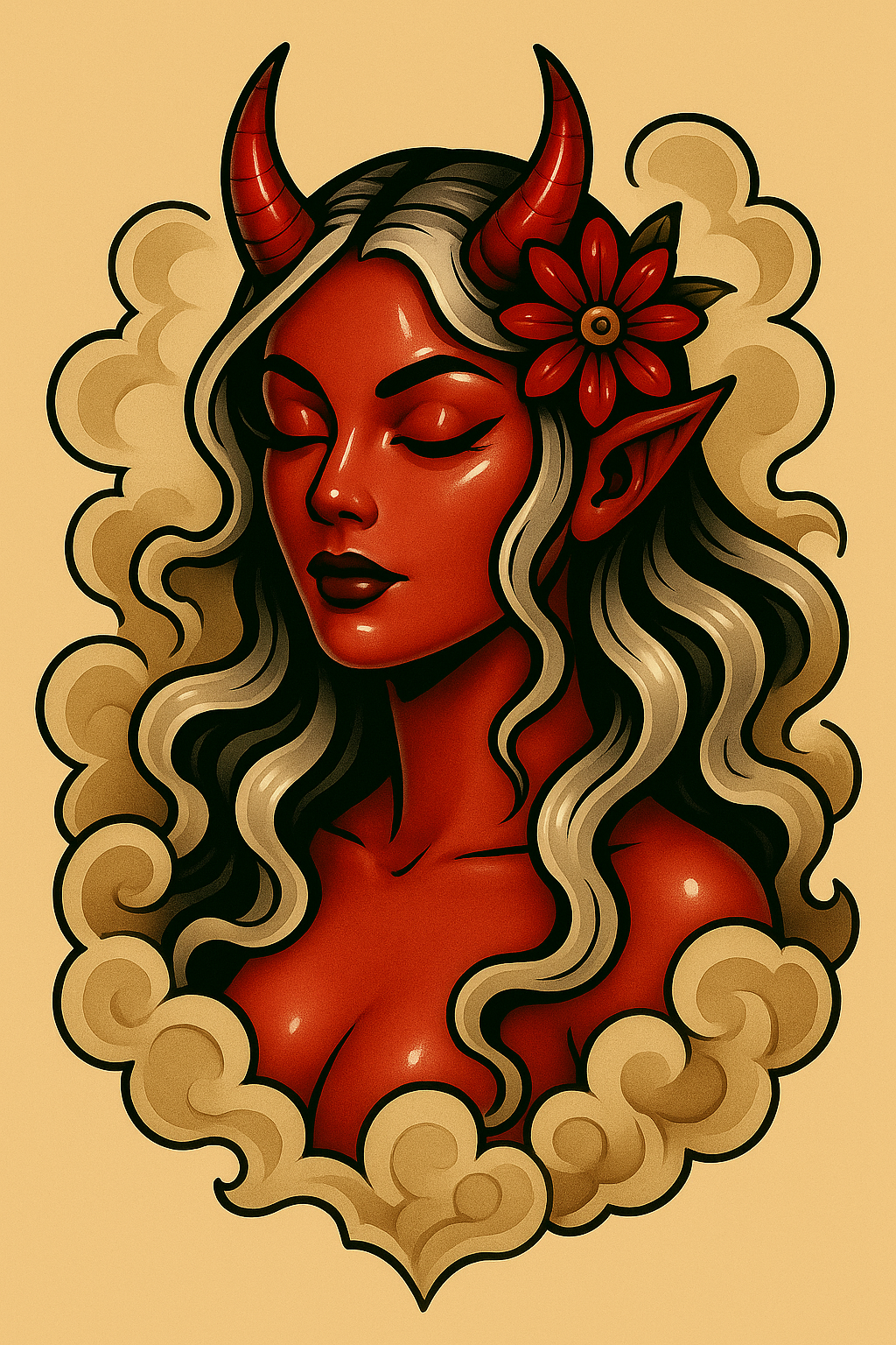 /Collection: /by davooda/Type: PNG/A striking portrait of a demon girl with red skin, elegant white hair, and decorative horns. She features a flower in her hair, set against a soft beige background.