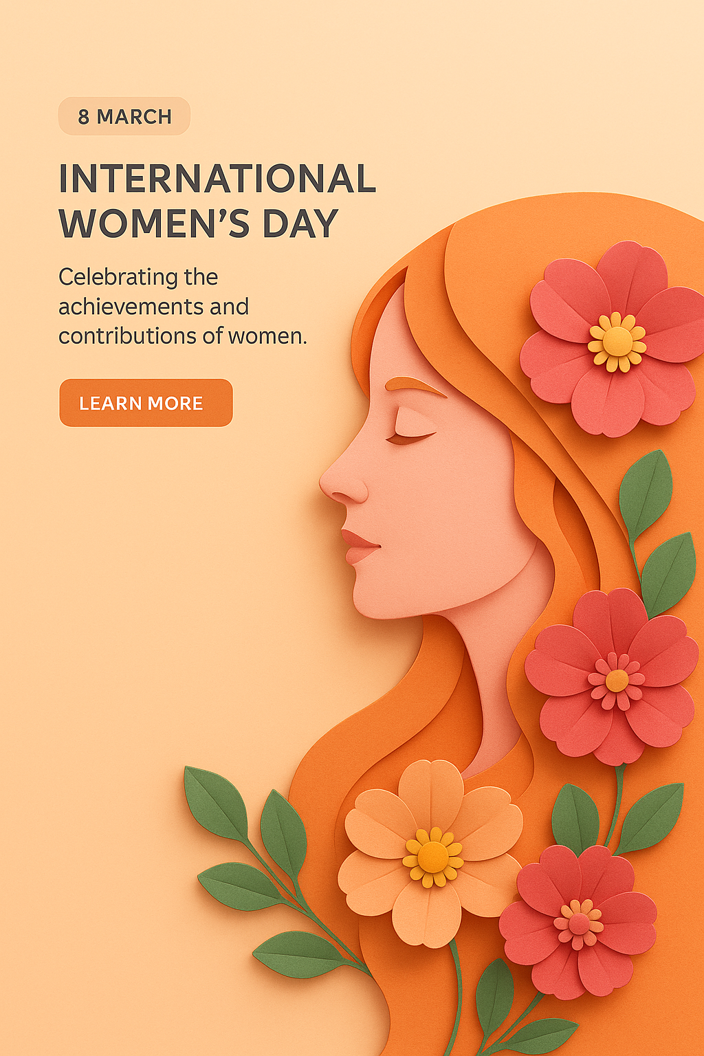 /Collection: /by davooda/Type: PNG/A vibrant 3D illustration featuring a woman's profile adorned with colorful flowers, celebrating International Women's Day. The design includes a gradient background and informative text.
