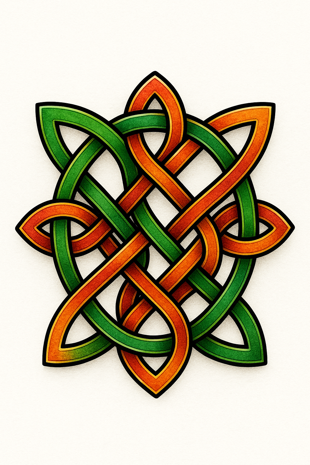A beautifully crafted Celtic knot design featuring intertwining bands in green, orange, and black outlines. Ideal for cultural art, tattoo designs, or decorative elements.