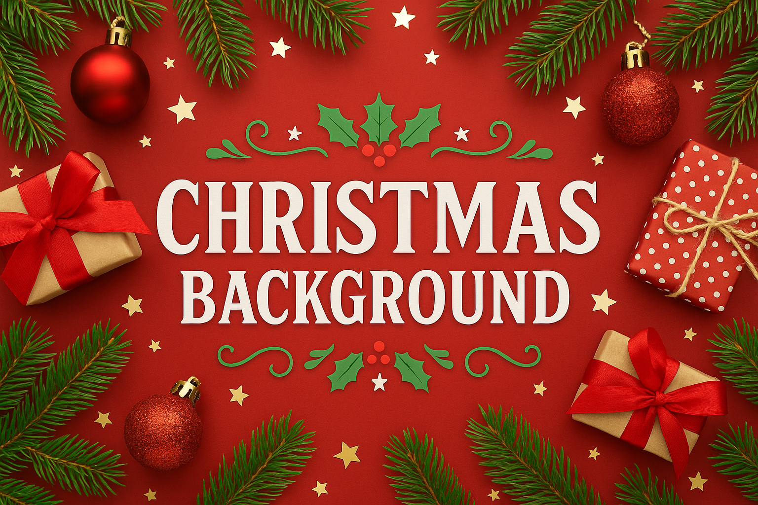 /Collection: /by davooda/Type: PNG/Vibrant Christmas-themed background featuring decorative elements like ornaments, gifts, and pine branches, ideal for holiday promotions and festive greetings.