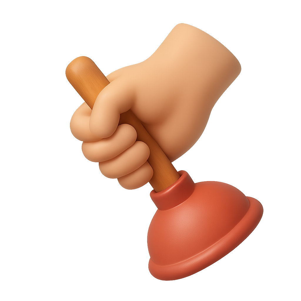 A stylized 3D icon depicting a hand gripping a plunger. The design features a transparent background and showcases a three-quarter isometric view with a volumetric feel.