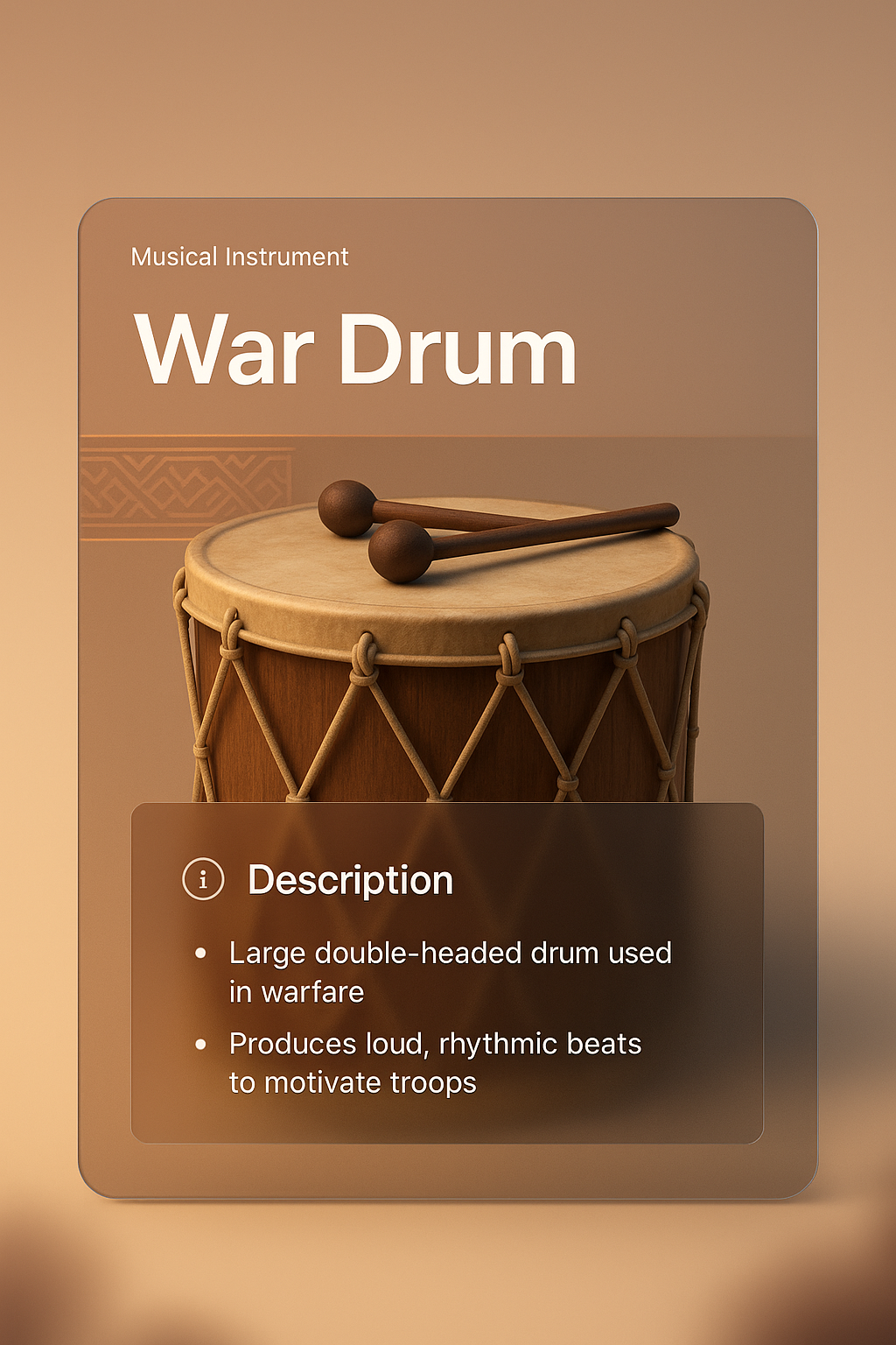 A visually appealing 3D design of a war drum with a transparent overlay showcasing essential information. The light-toned background enhances the readability of text.