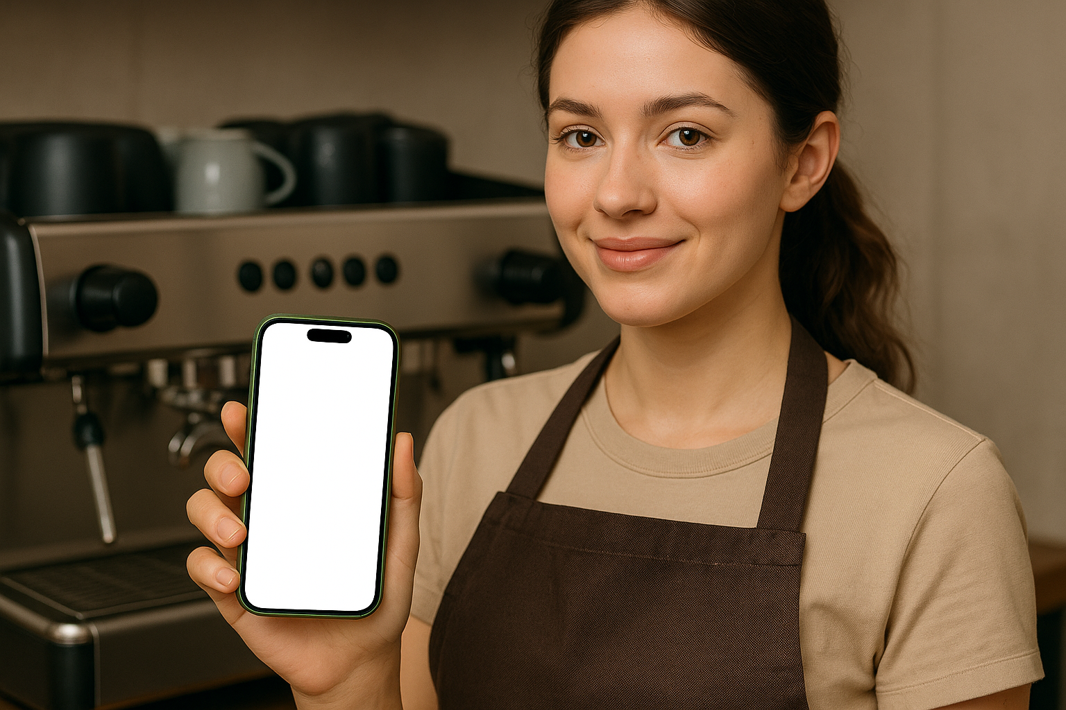 A young barista in a brown apron smiles while holding a green smartphone with a blank screen in front of a coffee machine. The setting is cozy and inviting.