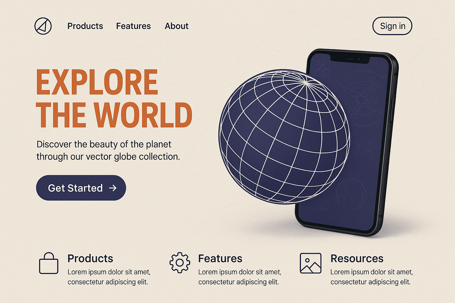 A modern landing page design featuring a geometric globe emerging from a smartphone. The layout is clean with bold typography, action buttons, and sections for products and features.