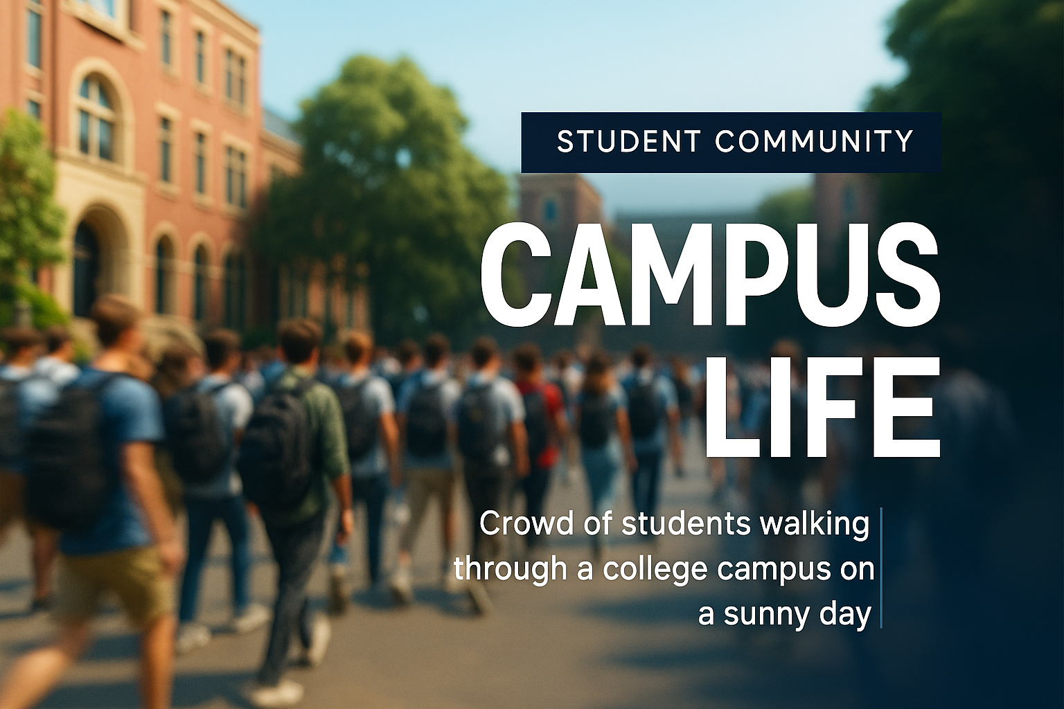 A lively scene depicting a crowd of students walking through a college campus on a sunny day, showcasing motion blur for a dynamic effect.