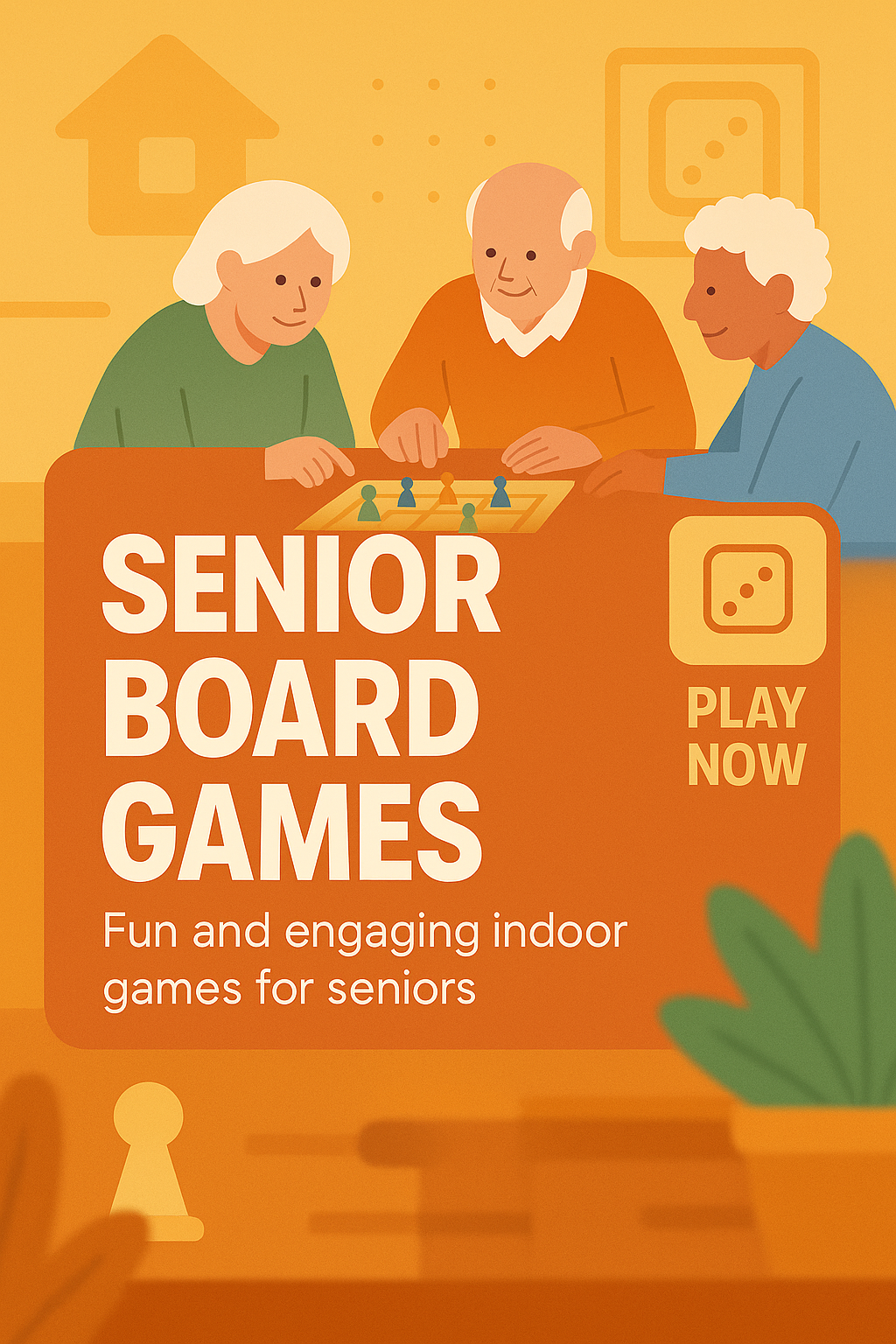 Colorful and engaging graphic showcasing seniors playing board games, designed to promote fun indoor activities tailored for older adults. Ideal for marketing and community programs.