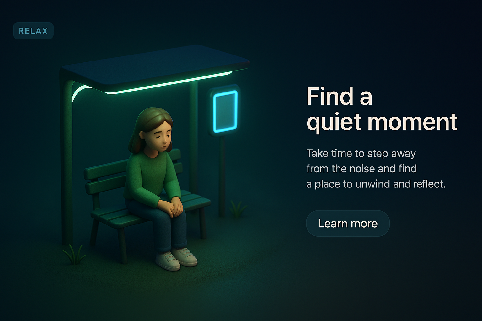 A serene 3D scene featuring a girl sitting on a bench under a neon-lit bus stop. The dark background accentuates the glowing elements, promoting a calming atmosphere.