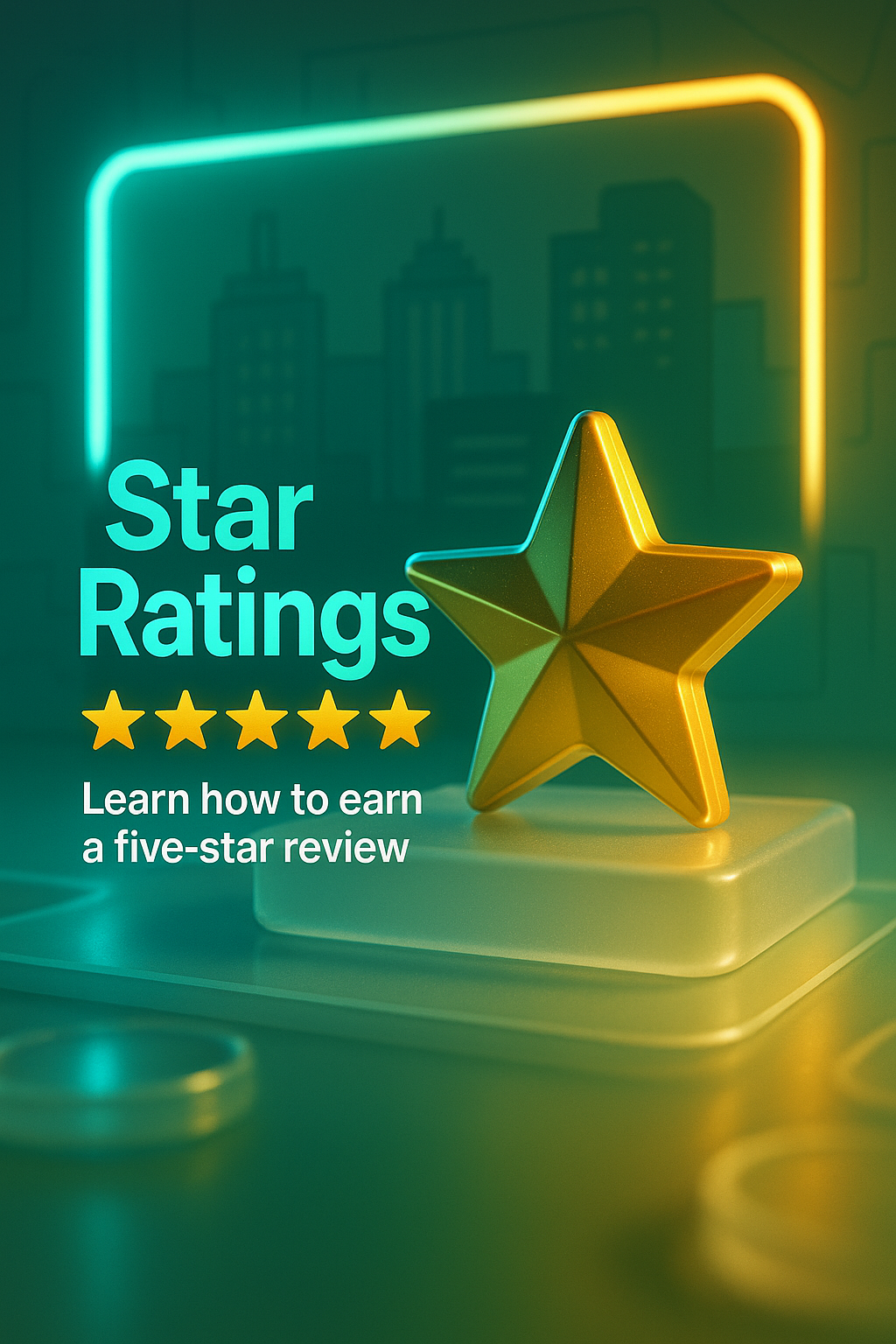 Stylized graphic representing star ratings with a glowing city backdrop, ideal for marketing content or educational materials on customer reviews.