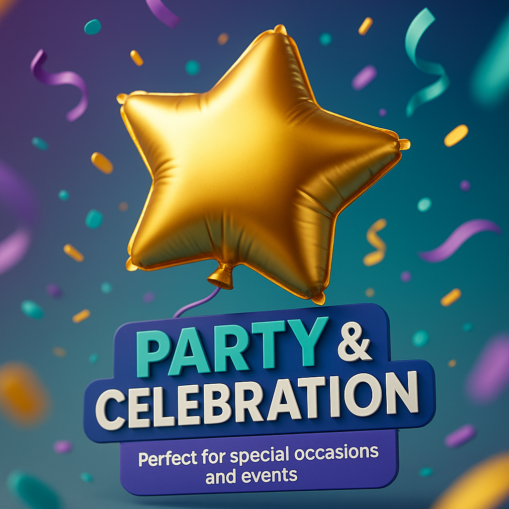 /Collection: /by davooda/Type: PNG/A vibrant graphic featuring a golden star balloon with colorful confetti, designed for party and celebration themes. Ideal for social media or event promotions.