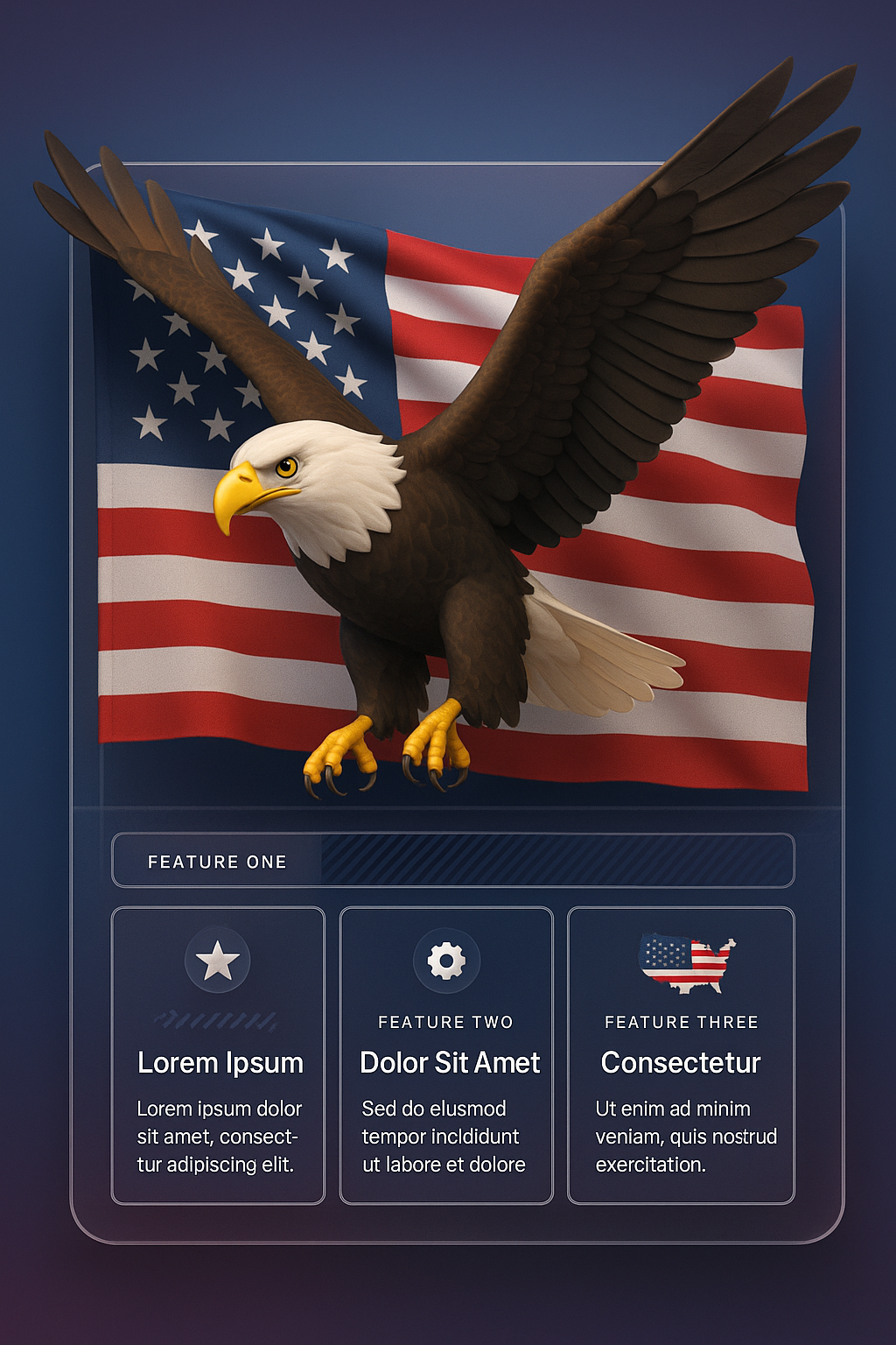 A vibrant 3D illustration featuring a bold eagle in front of the American flag, integrated with feature blocks displaying descriptions and graphics.