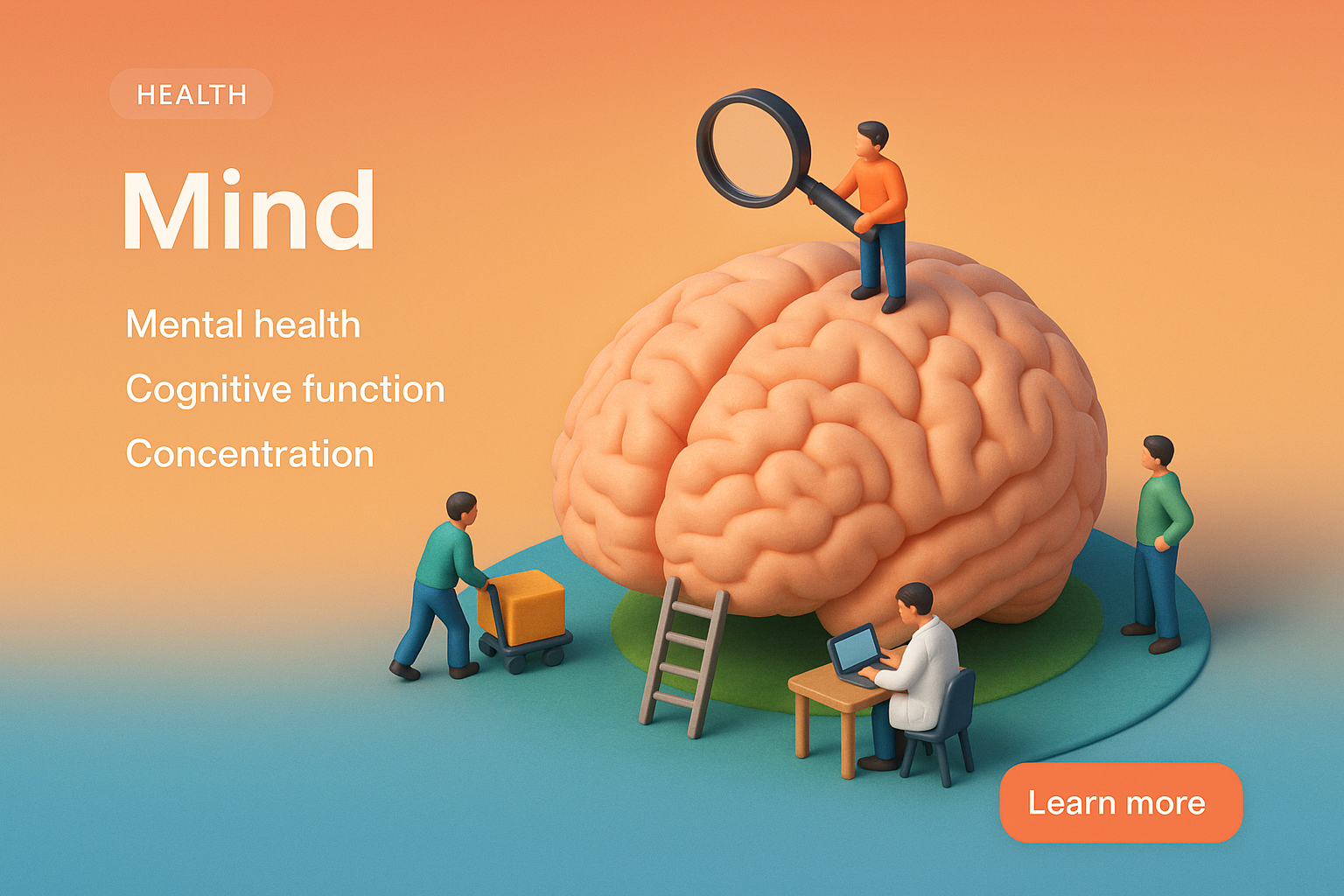 A visually engaging 3D scene featuring small characters interacting with a large brain, symbolizing mental health and cognitive functions. The background features a smooth gradient.