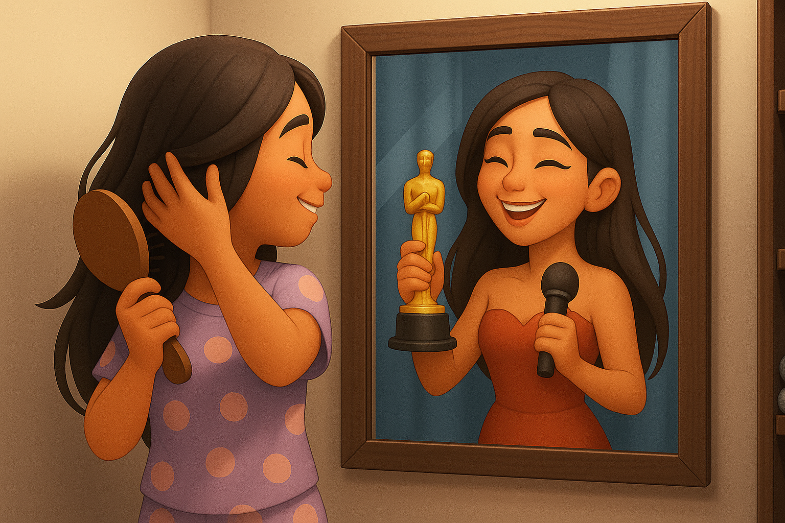 /Collection: /by davooda/Type: PNG/Charming animated scene depicting a young girl admiring her future self with an Oscar in a mirror, showcasing themes of ambition and dreams. Ideal for motivational content aimed at young audiences.