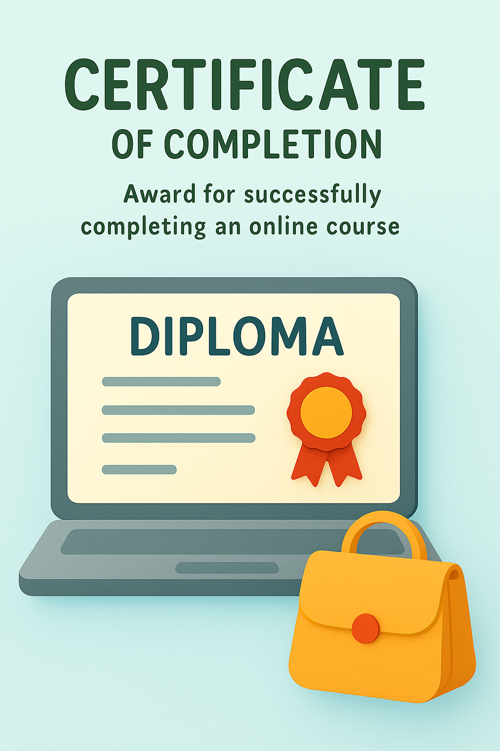 /Collection: /by davooda/Type: PNG/Illustrative graphic representing a digital certificate of completion for online courses, featuring a laptop and a diploma design, ideal for educational promotions.