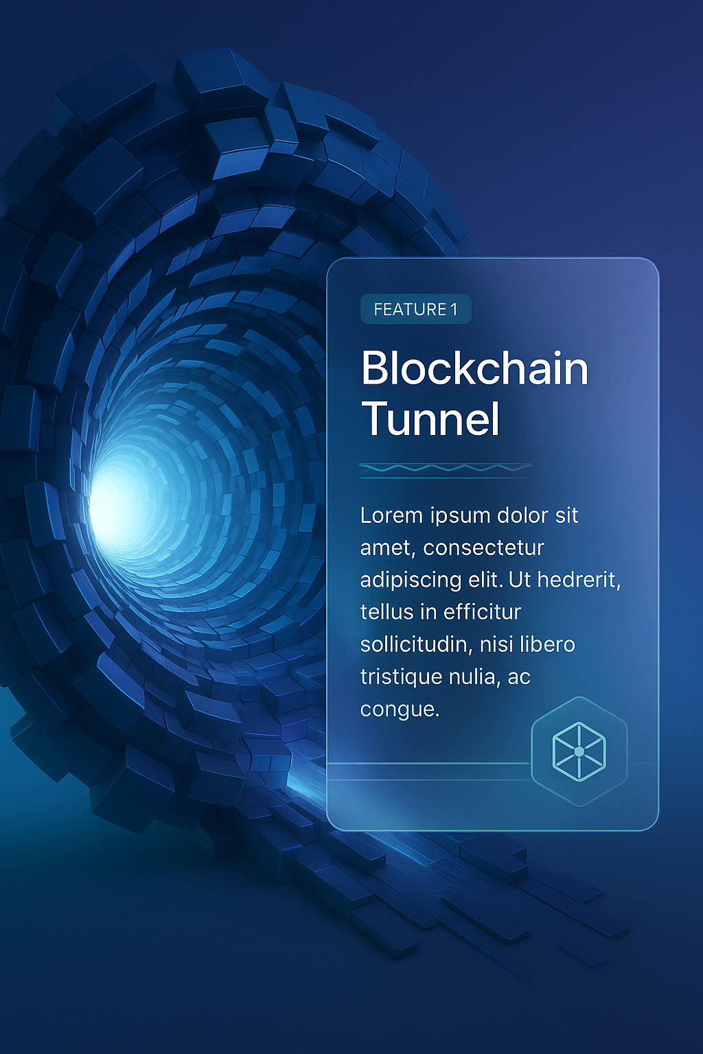 A 3D illustration of a blockchain tunnel with a glowing exit. The design features a gradient background, integrated feature blocks with text and graphics, and a modern aesthetic.