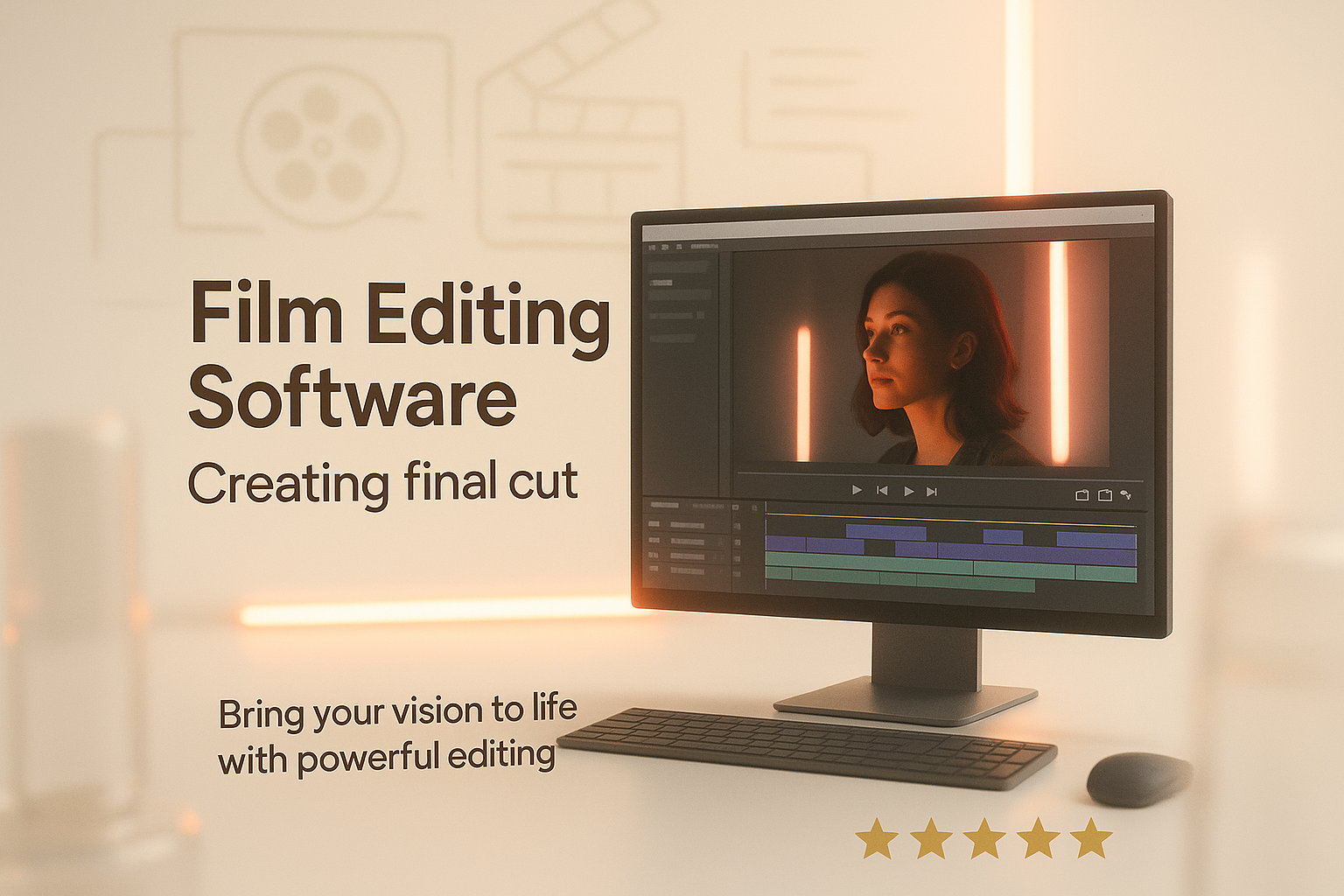 /Collection: /by davooda/Type: PNG/Promotional image featuring a computer screen displaying film editing software in a stylish, modern setting. Ideal for marketing digital editing tools to filmmakers and content creators.
