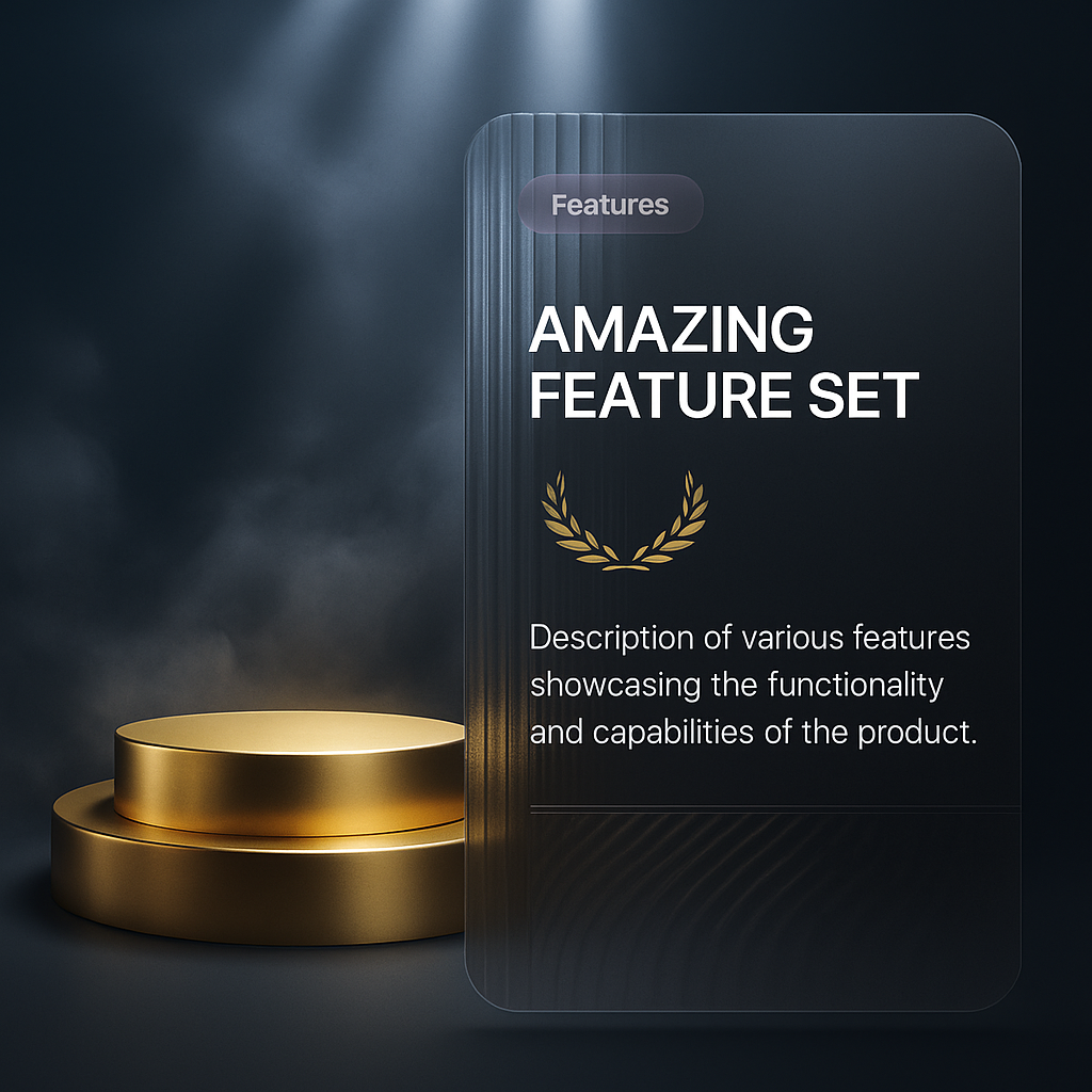 A gold podium illuminated by spotlights against a dark background, enveloped in smoke. Features a transparent display showcasing features with a sophisticated design.