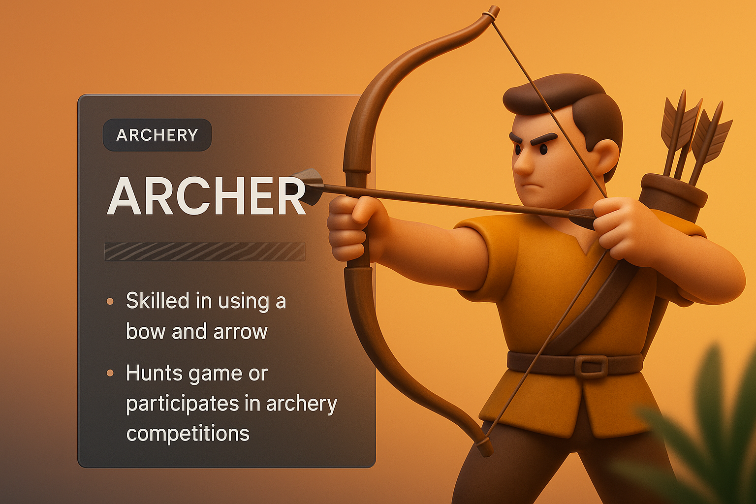 A dynamic 3D illustration of an archer aiming with a bow, accompanied by text blocks that provide details about archery. The design features a gradient background and modern visual elements.