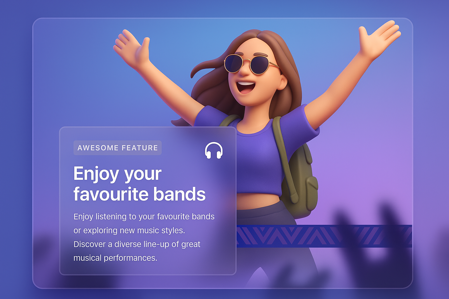 /Collection: /by davooda/Type: PNG/A colorful 3D illustration featuring a young woman enjoying a music festival. She wears sunglasses and has her arms raised in excitement, surrounded by a dynamic background.