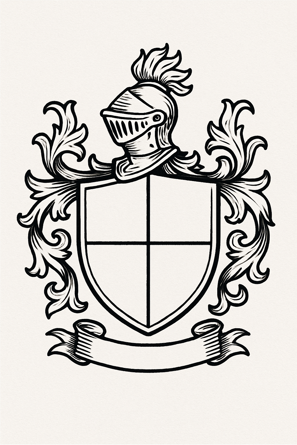 This image features a detailed heraldic crest with ornate decorative elements and a knight's helmet. Ideal for branding or historical themes.