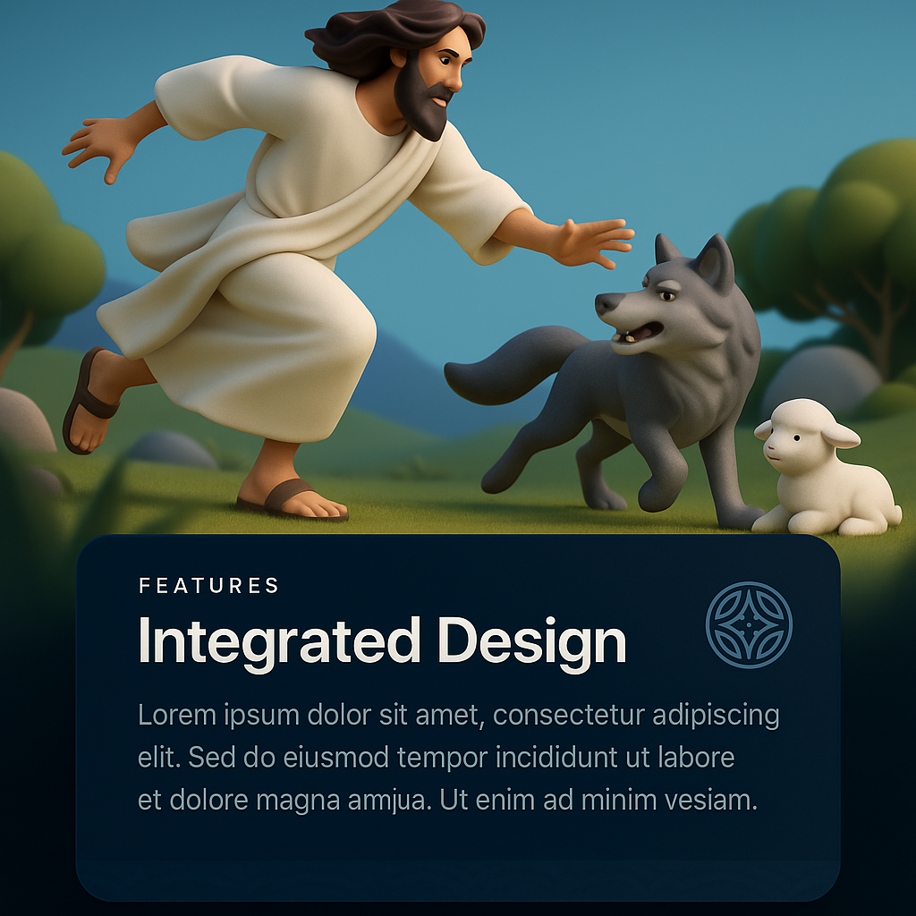/Collection: /by davooda/Type: PNG/A dynamic 3D illustration depicts Jesus running towards a wolf and a lamb, set against a smooth gradient background. The scene captures a sense of movement and harmony.