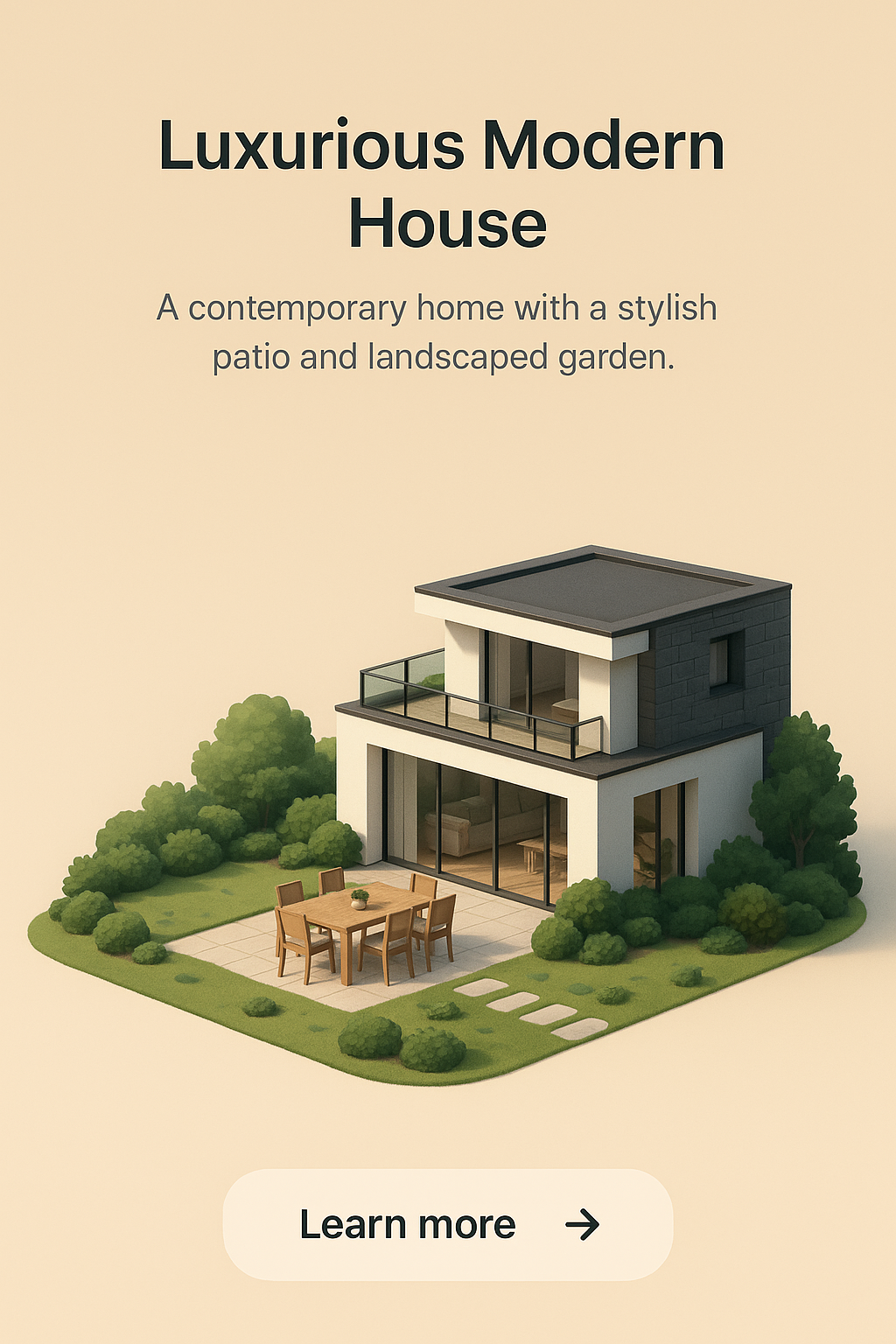 /Collection: /by davooda/Type: PNG/A beautifully designed modern house featuring a stylish dining area and a well-kept garden. The scene is captured from a distance, showcasing the entire layout in a realistic 3D style.