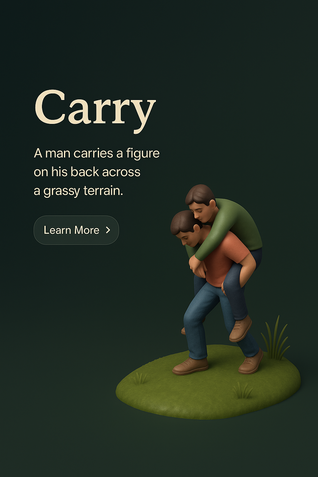 A detailed 3D illustration showing a man carrying another person on his back across grassy terrain, set against a smooth dark gradient background.