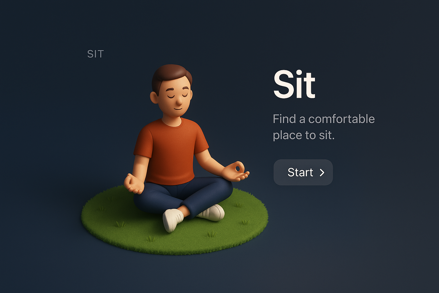 /Collection: /by davooda/Type: PNG/A serene 3D scene featuring a character meditating in a peaceful setting. The background is dark with a smooth gradient, enhancing the calm atmosphere. The character sits cross-legged on a grassy patch, promoting relaxation.