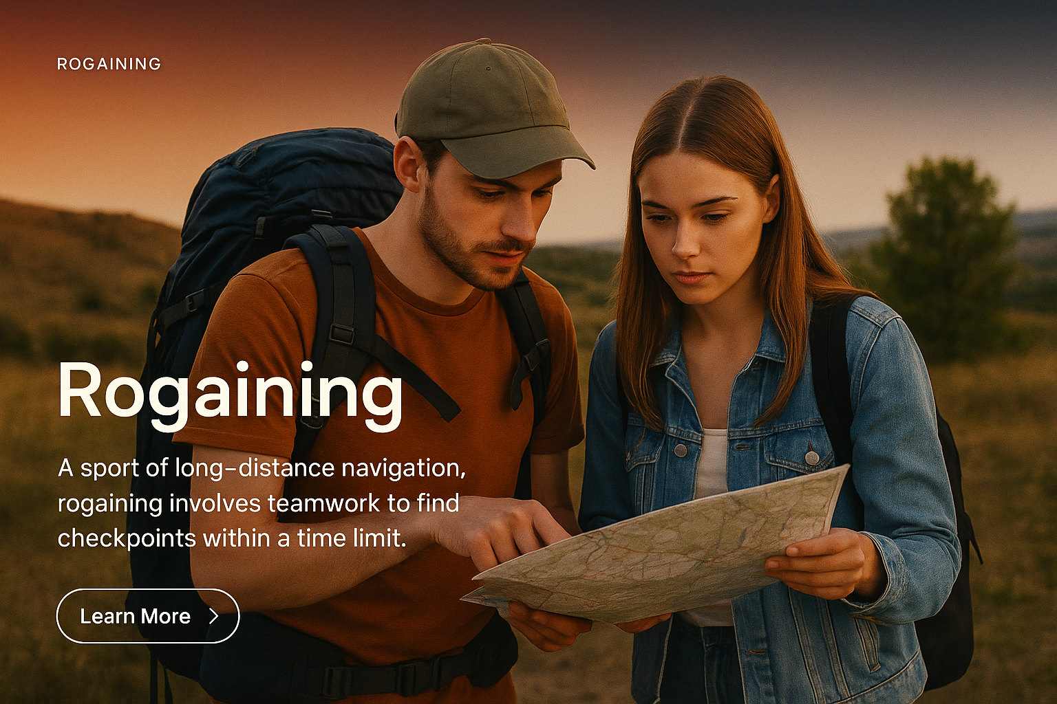 A visually appealing web design showcasing a couple studying a map in nature, emphasizing teamwork in rogaining. The layout features a gradient background and clear action buttons.