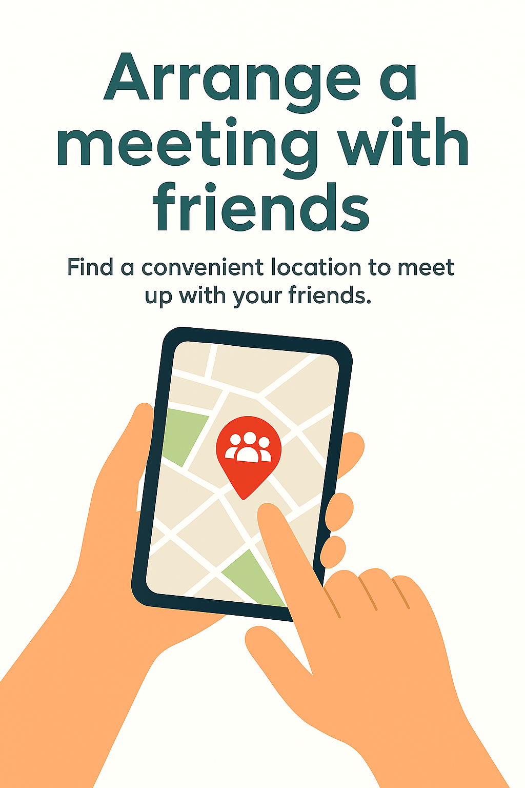 /Collection: /by davooda/Type: PNG/A digital illustration showcasing a hand holding a smartphone displaying a map, symbolizing the concept of arranging meetings with friends. Ideal for social apps or event planning.