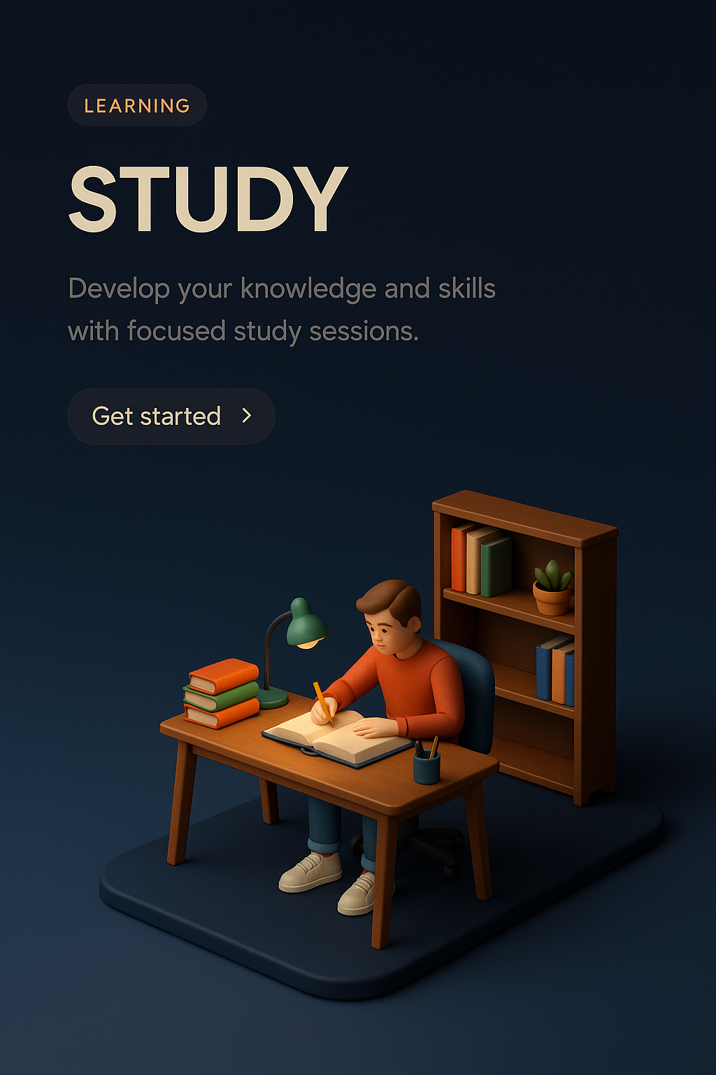 /Collection: /by davooda/Type: PNG/A zoomed-out 3D illustration showing a study environment. The scene features a young person studying at a desk with books, a lamp, and a bookshelf in a dark gradient background.