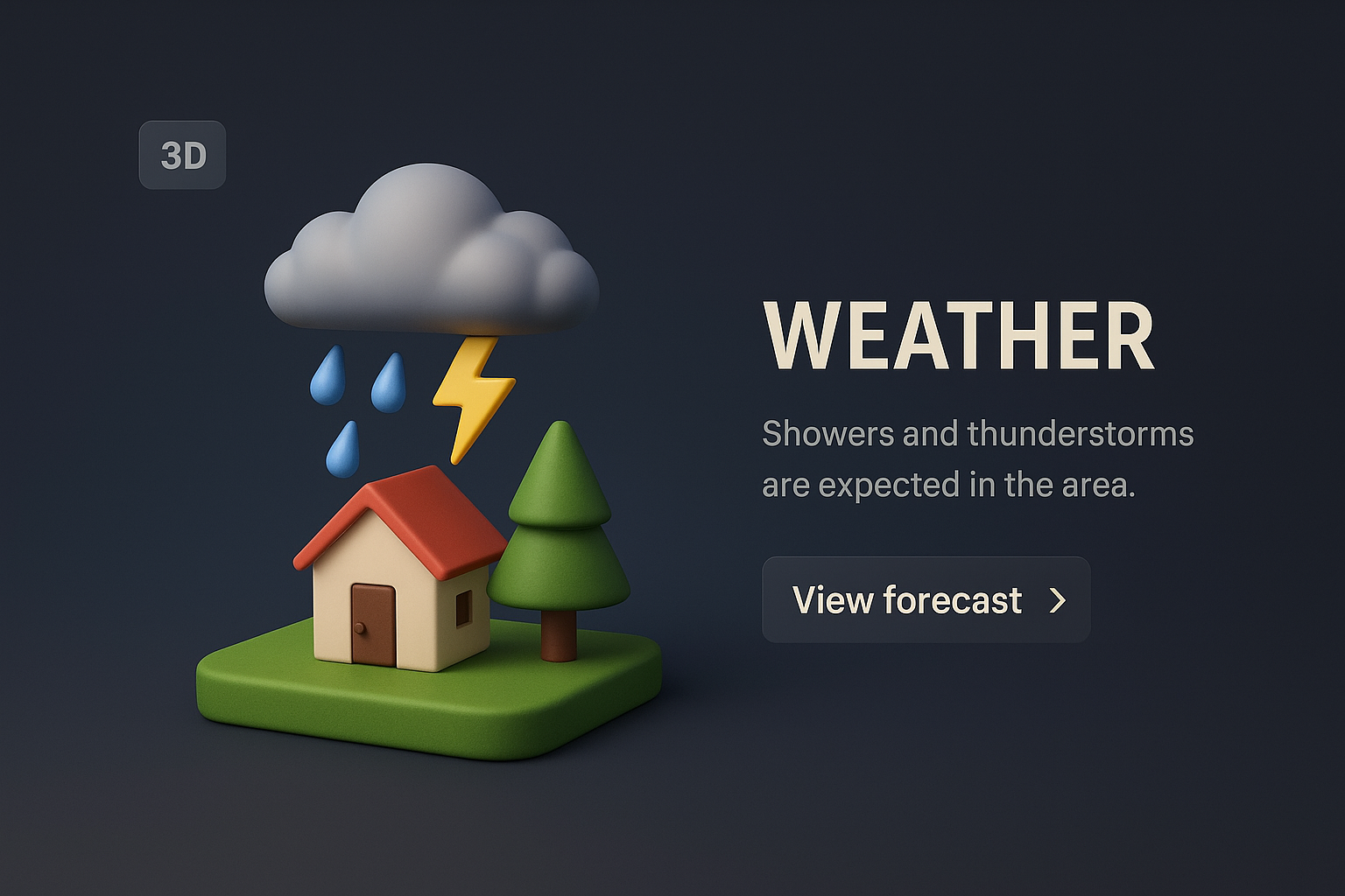 A visually striking 3D scene depicting a house under a stormy sky with rain and lightning. The design includes a dark gradient background, enhancing the vivid colors of the elements.