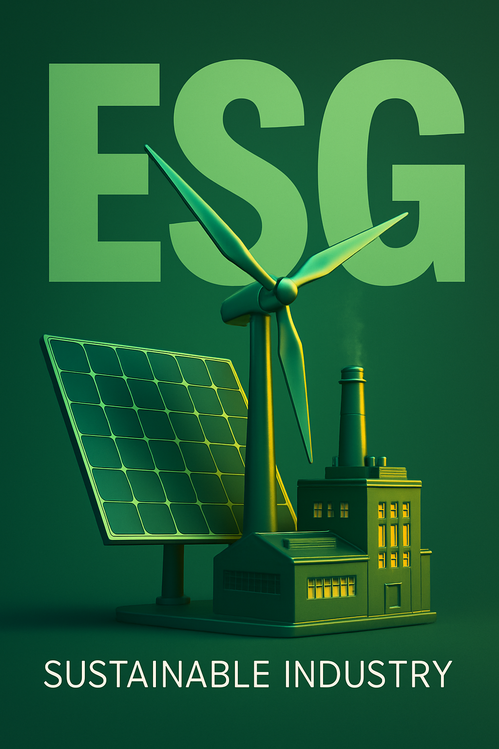 A striking 3D representation of ESG with wind turbines and solar panels, set against a gradient background. The massive bold letters dominate the upper half, creating a modern and cinematic look.