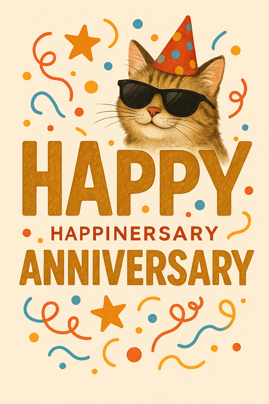 A whimsical illustration of a cat wearing sunglasses and a party hat, surrounded by festive decorations. Ideal for a lighthearted anniversary celebration.