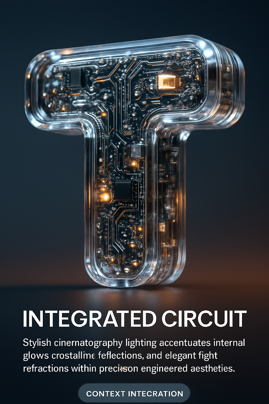 /Collection: /by davooda/Type: PNG/This image features a hyperrealistic depiction of an integrated circuit shaped like the letter 'T'. The design showcases glass-like polymers, glowing micro-LEDs, and intricate metallic components. Soft cinematography lighting highlights its internal glows and reflections.