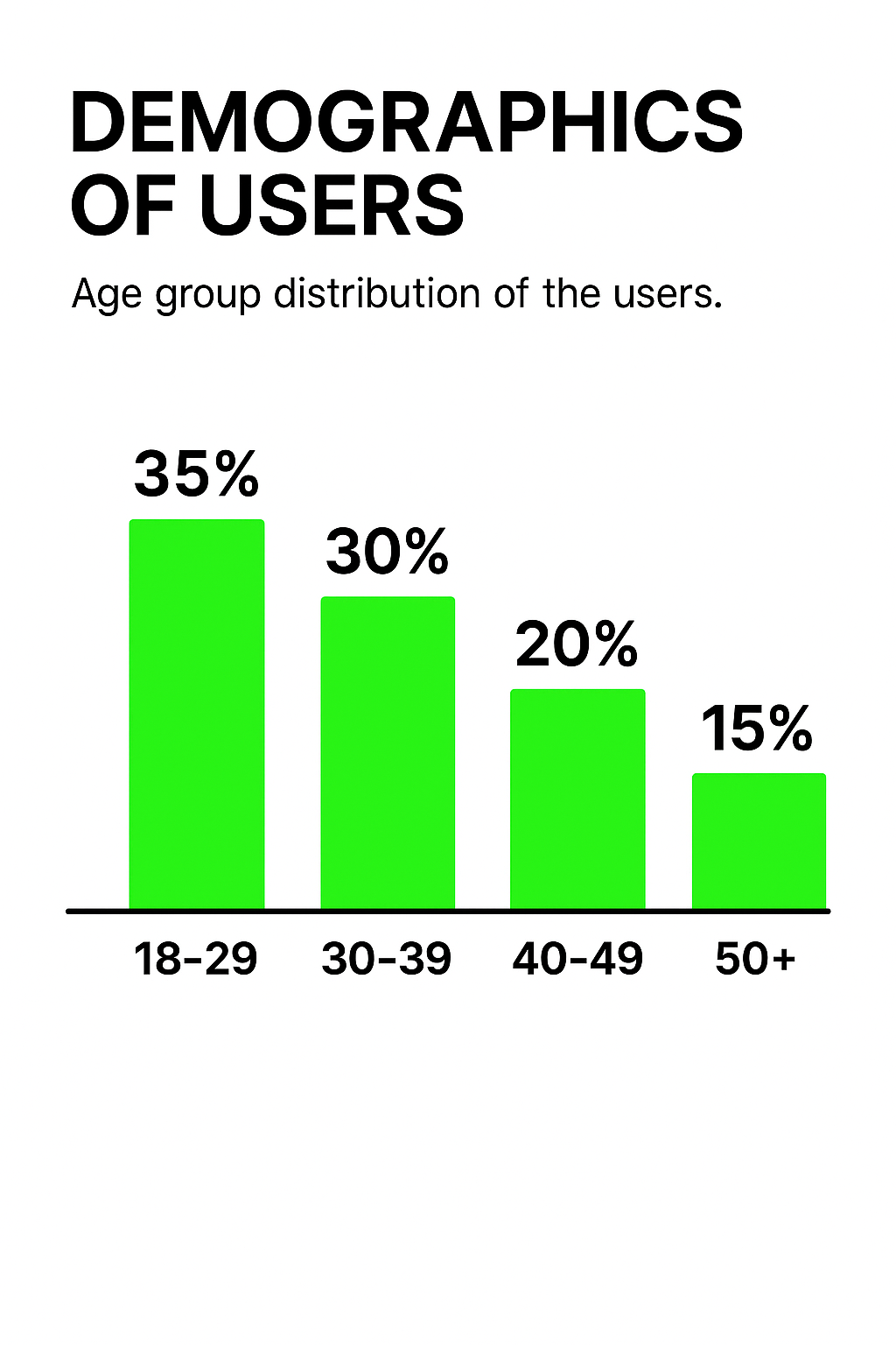 Infographic representing user demographics with age group distribution using vibrant bar chart design. Ideal for presentations and reports.