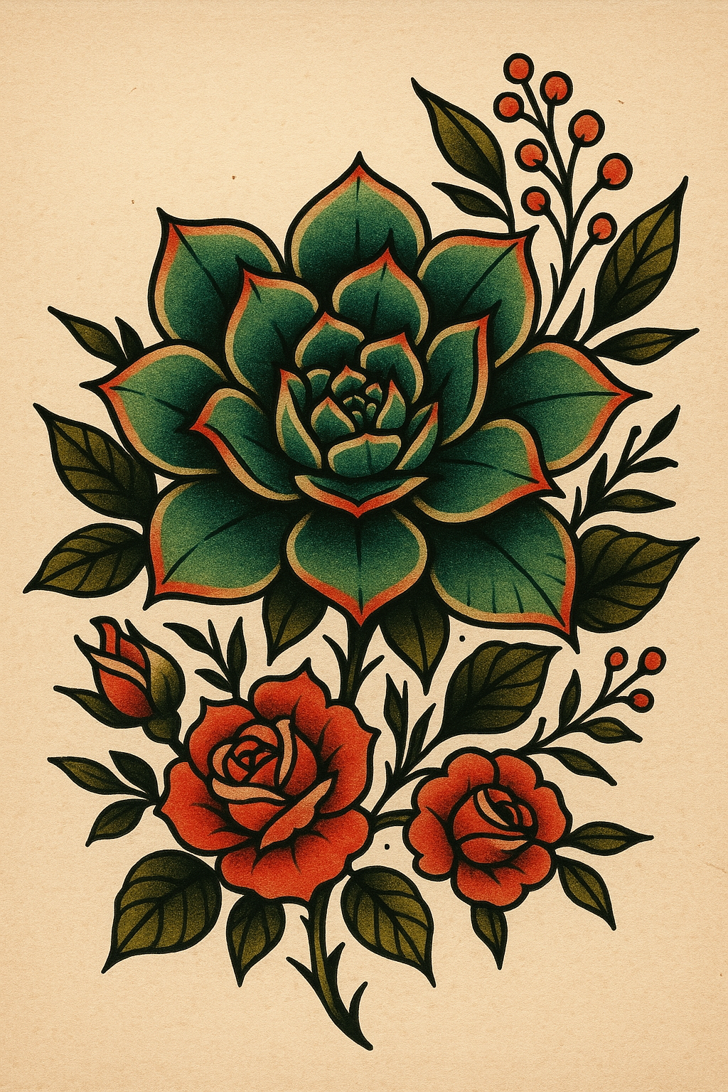 /Collection: /by davooda/Type: PNG/This image showcases a colorful tattoo design featuring a succulent and roses, with bold outlines and vibrant colors, suitable for tattoo enthusiasts and artists.