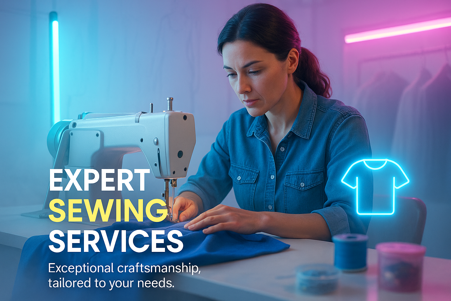 /Collection: /by davooda/Type: PNG/A visually appealing promotional graphic showcasing sewing services, featuring a seamstress at work. The modern design incorporates vibrant neon elements, making it suitable for social media or website use.